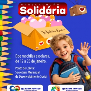 Quatro Pontes promove Arrecadação Solidária de Mochilas como ação complementar ao Cartão Volta às Aulas