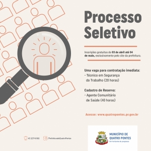 Prefeitura de Quatro Pontes abre inscrições para processo seletivo em segurança do trabalho e agente comunitário de saúde