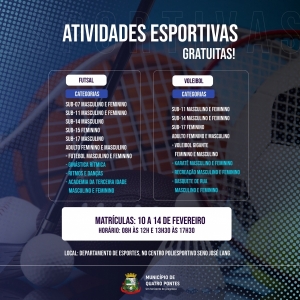 Abertas as matrículas para oficinas de cultura e atividades esportivas em Quatro Pontes
