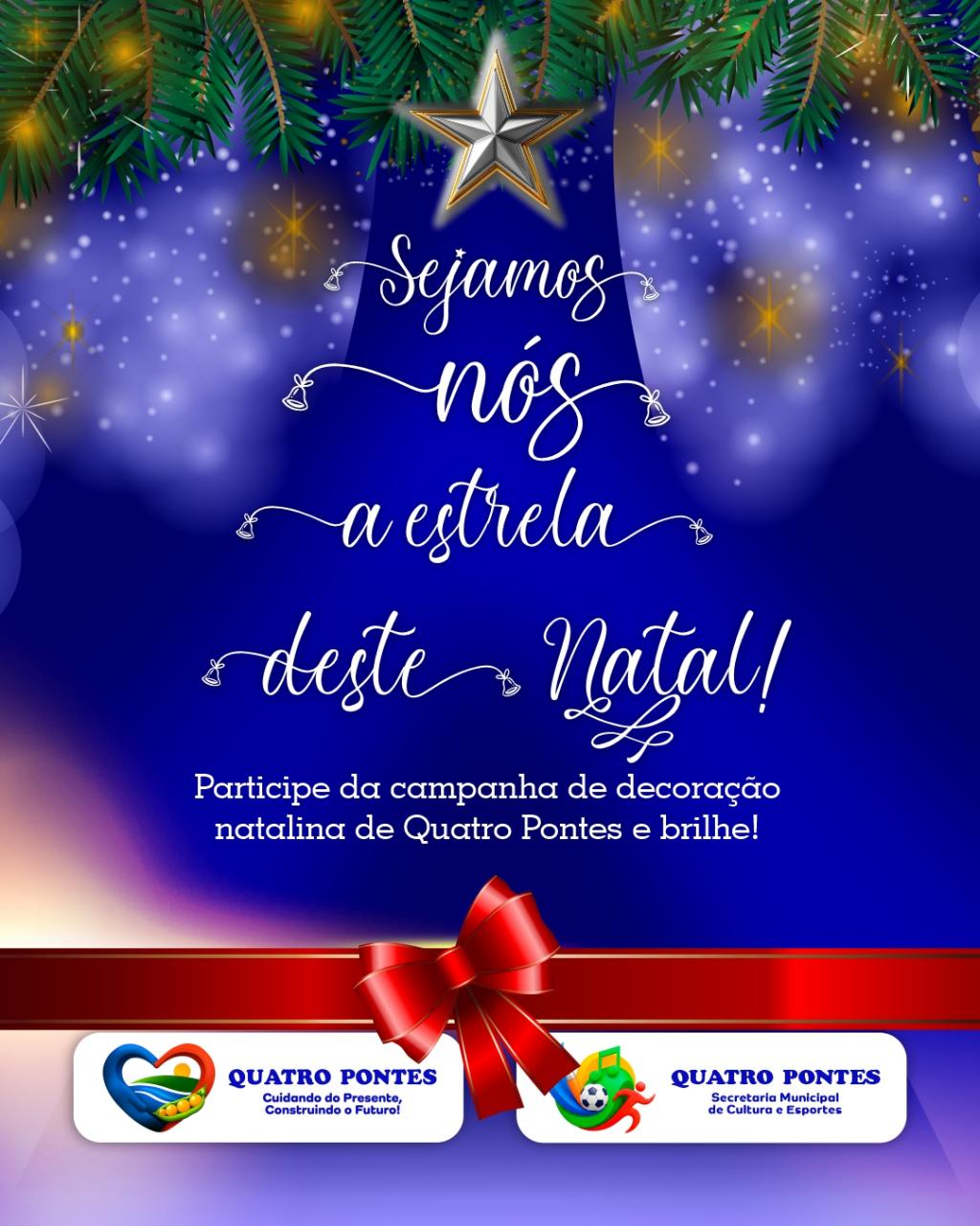A Prefeitura de Quatro Pontes reforça que as inscrições para o Concurso de Decoração Natalina 2025 seguem abertas até o dia 28 de novembro. A iniciativa, regulamentada pelo Decreto nº 184/2025, tem como objetivo incentivar o espírito natalino, fortalecer o comércio local e valorizar a cultura e o turismo do município.