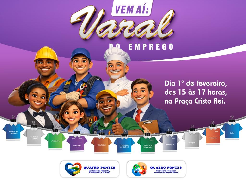 Quatro Pontes, 13 de janeiro de 2026 – A Prefeitura de Quatro Pontes, por meio da Secretaria Municipal de Desenvolvimento Social, realizará no dia 1º de fevereiro de 2026 a segunda edição do Varal do Emprego, iniciativa voltada à aproximação entre trabalhadores e oportunidades disponíveis no mercado de trabalho local.