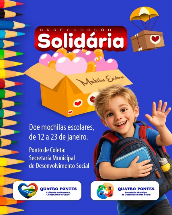 Quatro Pontes, 14 de janeiro de 2026 – A Prefeitura de Quatro Pontes, por meio da Secretaria Municipal de Desenvolvimento Social, está realizando a Arrecadação Solidária de Mochilas, iniciativa voltada ao apoio de crianças pertencentes a famílias em situação de vulnerabilidade social, atendidas pelos serviços do Centro de Referência de Assistência Social (CRAS).