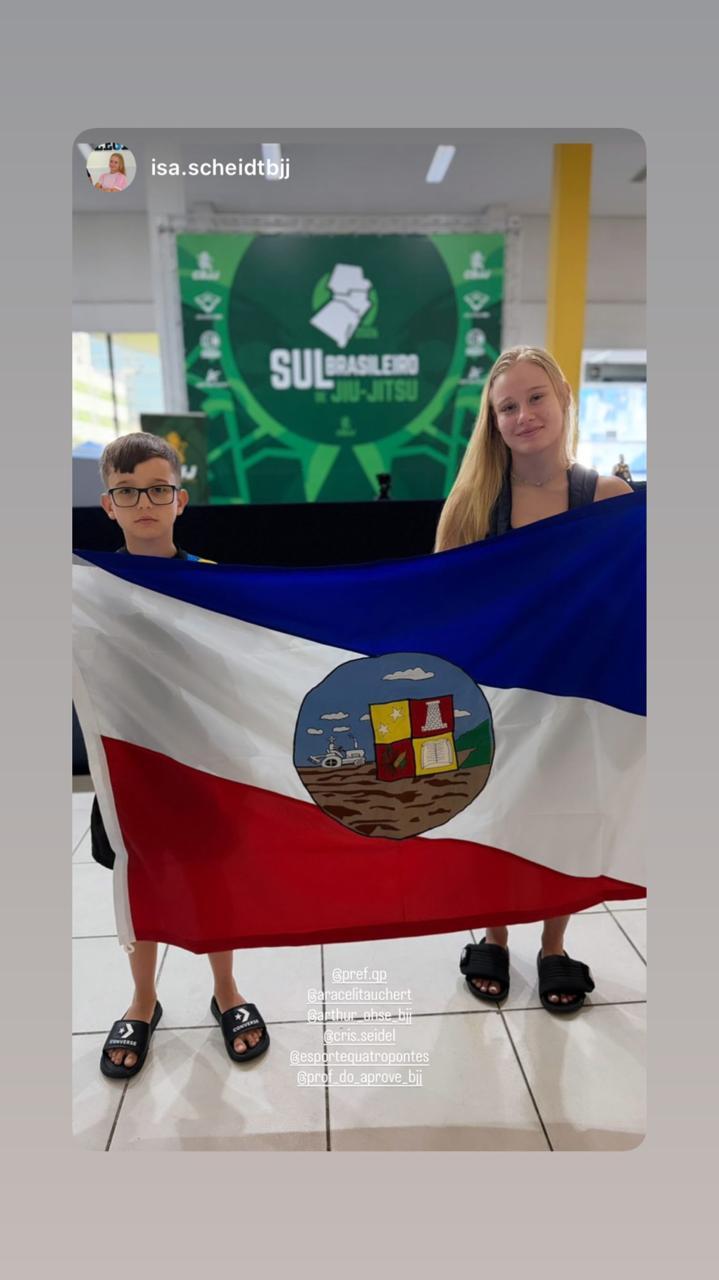 Quatro Pontes, 02 de fevereiro de 2026 – Os atletas Arthur Gabriel Wiebusch Ohse e Isabella Zarichta Scheidt, da modalidade Jiu-Jitsu, representaram o município de Quatro Pontes no Campeonato Sul-Brasileiro de Jiu-Jitsu, realizado entre os dias 31 de janeiro e 02 de fevereiro de 2026, na cidade de Florianópolis (SC). A participação contou com apoio do Programa Quatro Pontes Mais Esporte, instituído pela Lei Municipal nº 3.031/2025, de 24 de junho de 2025.