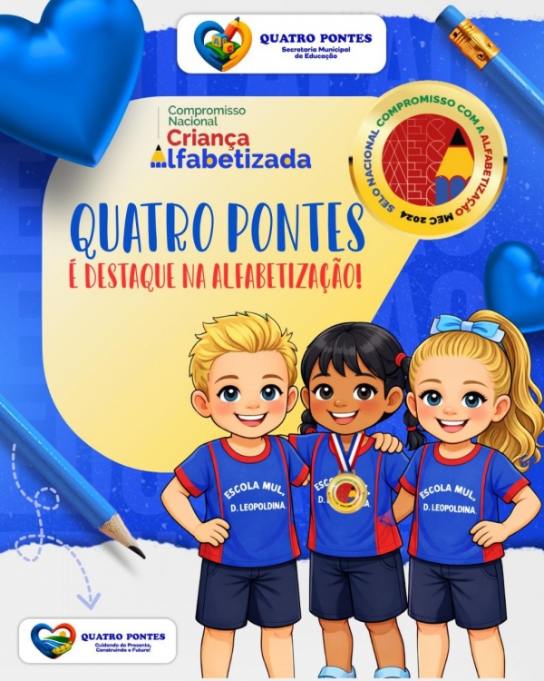 Quatro Pontes, 10 de fevereiro de 2026 – O município de Quatro Pontes conquistou o Selo Ouro no Selo Nacional Compromisso com a Alfabetização – Edição 2025, reconhecimento concedido pelo Ministério da Educação (MEC) às redes públicas que demonstram excelência na alfabetização das crianças na idade certa.