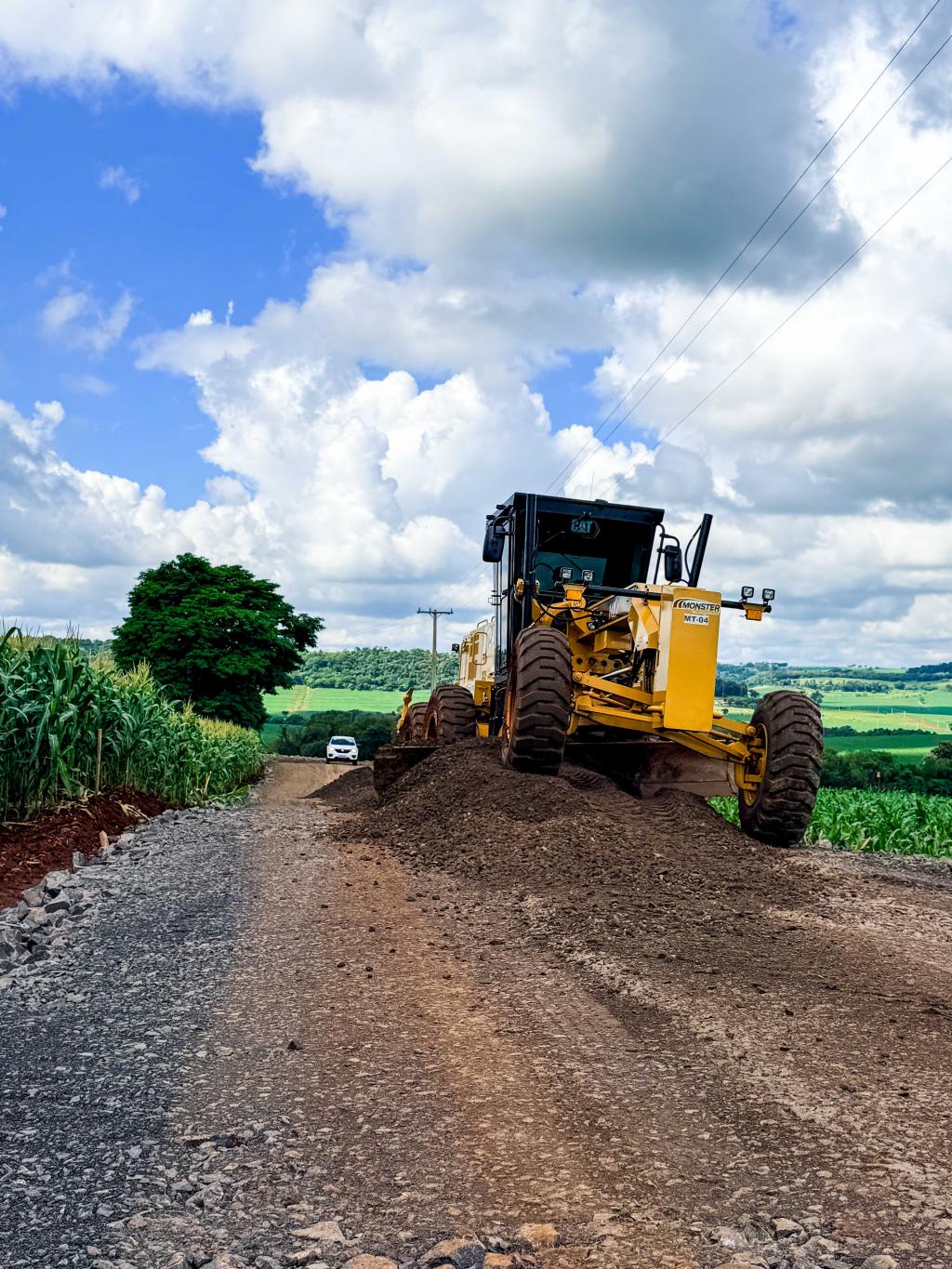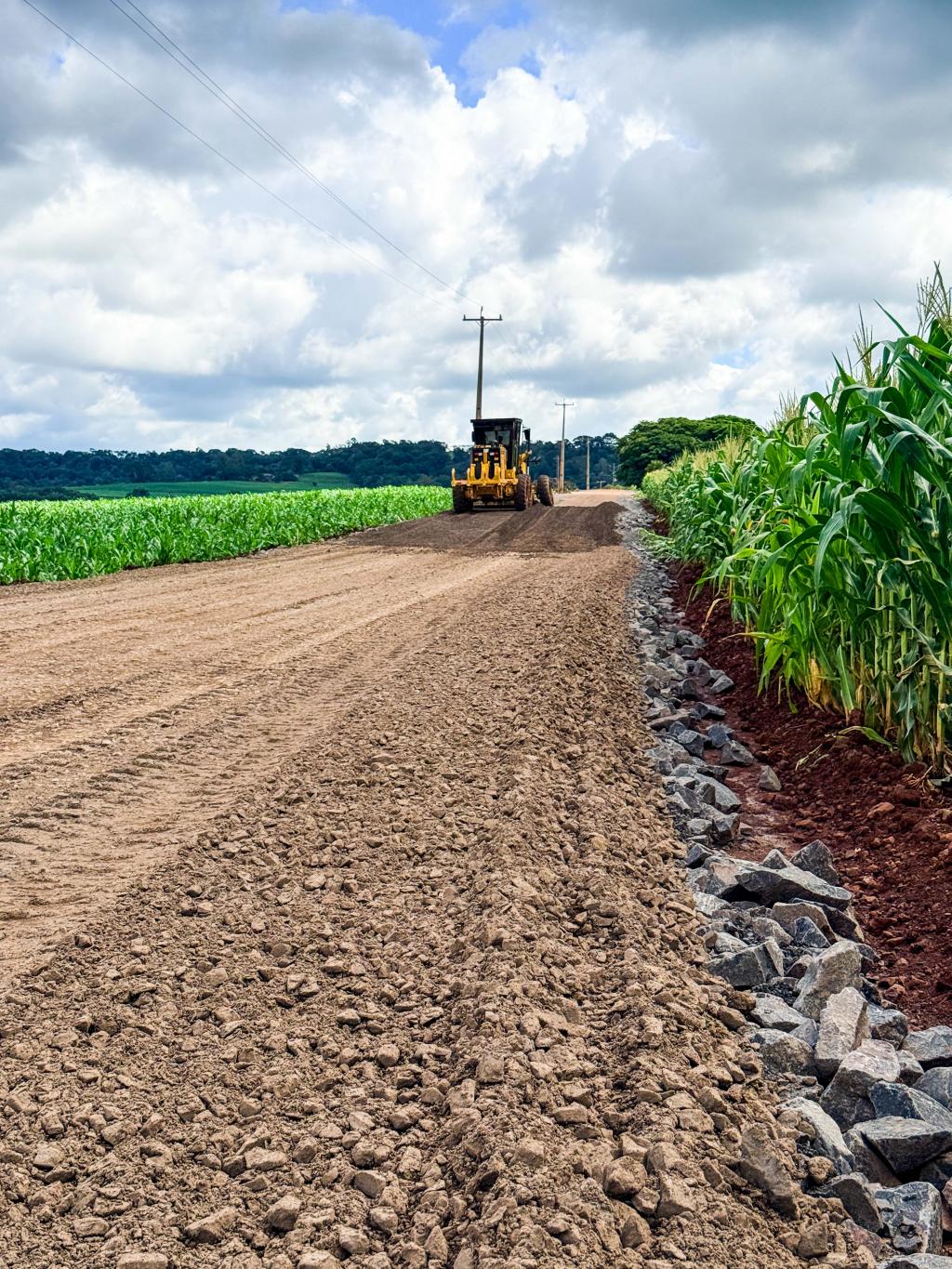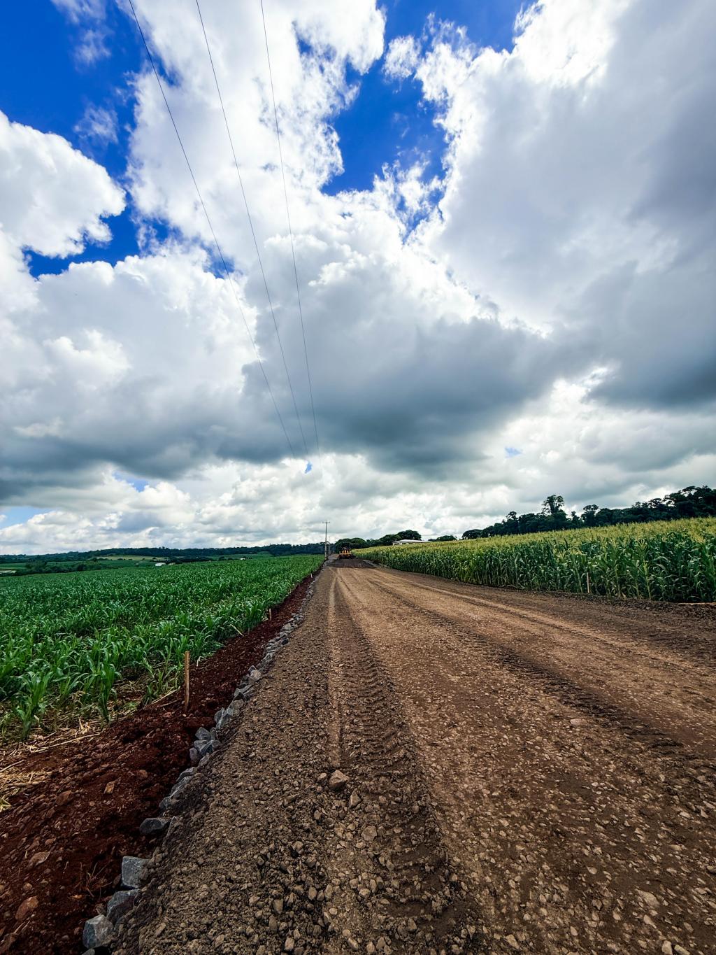Nesta fase da obra, no trecho da igreja até o cemitério, os trabalhos concentram-se na execução da base e da sub-base da estrada, etapas fundamentais para garantir a estabilidade e a durabilidade da pavimentação.