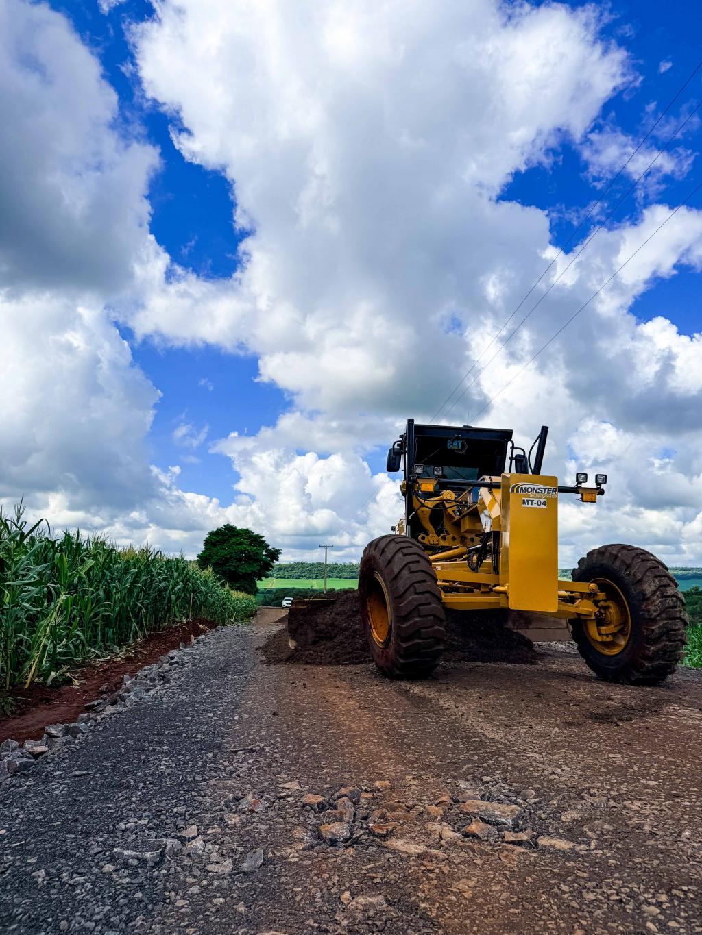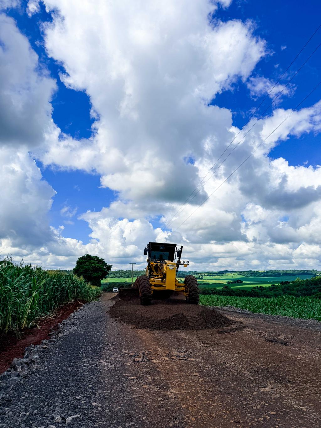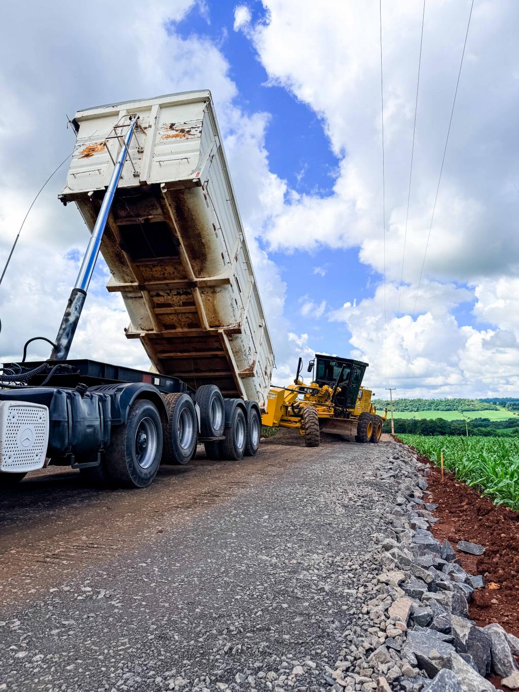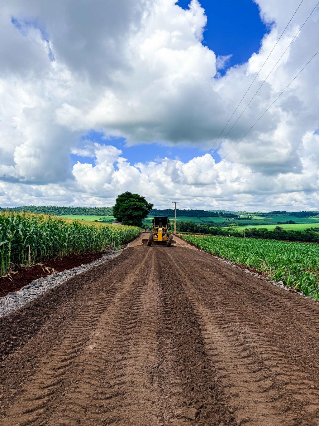 Nesta fase da obra, no trecho da igreja até o cemitério, os trabalhos concentram-se na execução da base e da sub-base da estrada, etapas fundamentais para garantir a estabilidade e a durabilidade da pavimentação.