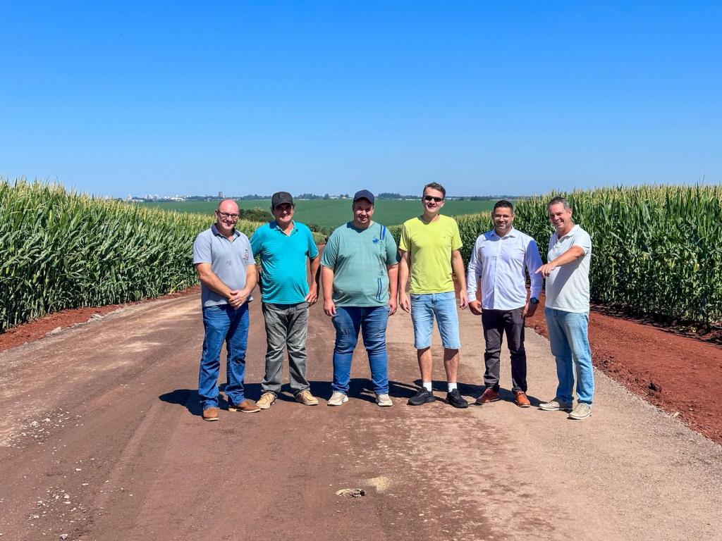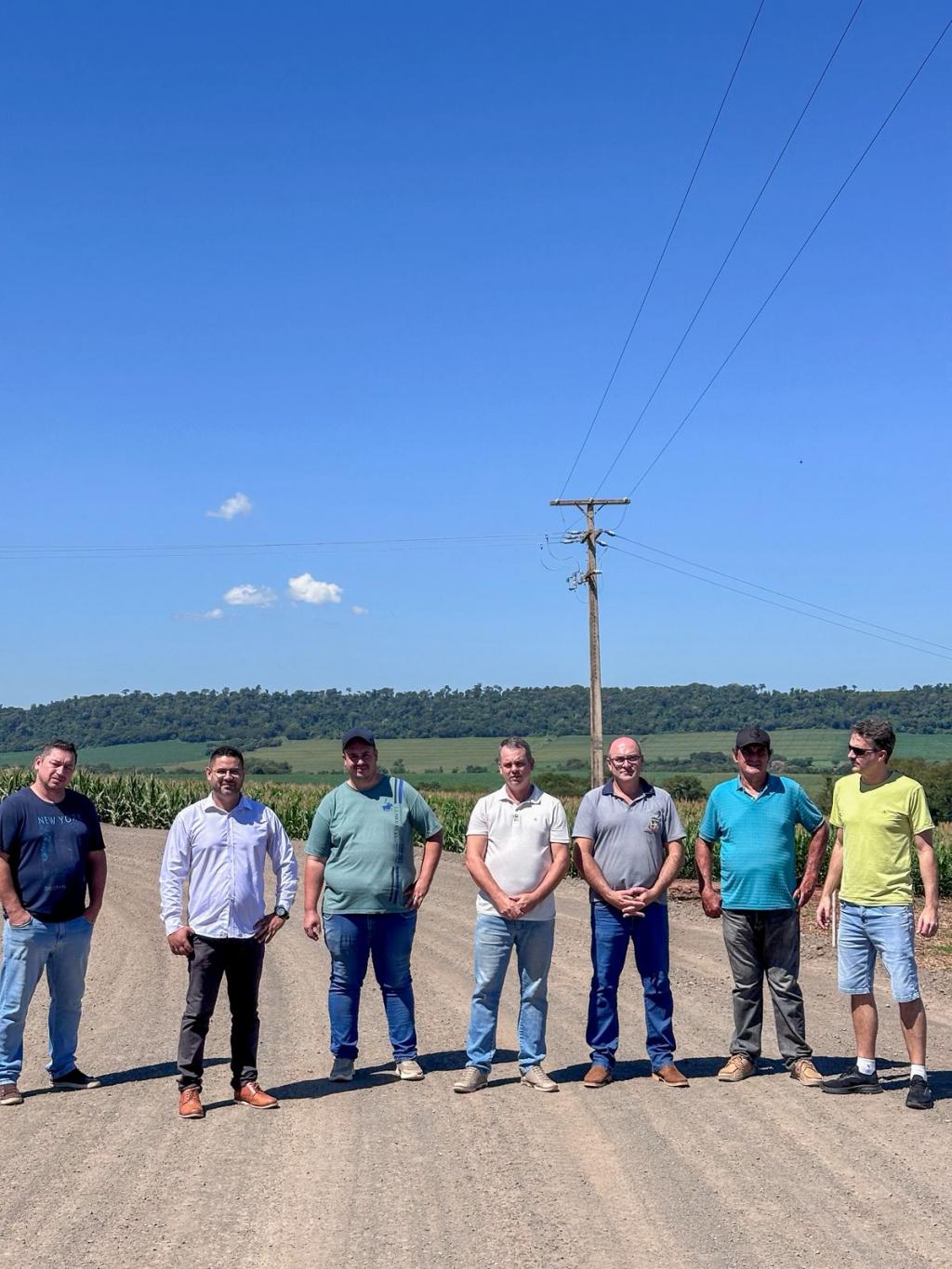 A vistoria contemplou trechos nas Linhas São José, Flor da Serra e Sanga Funda, onde estão sendo executadas obras de pavimentação asfáltica rural. Durante a visita, foram verificadas as etapas em andamento, a aplicação dos materiais e as condições gerais das intervenções.