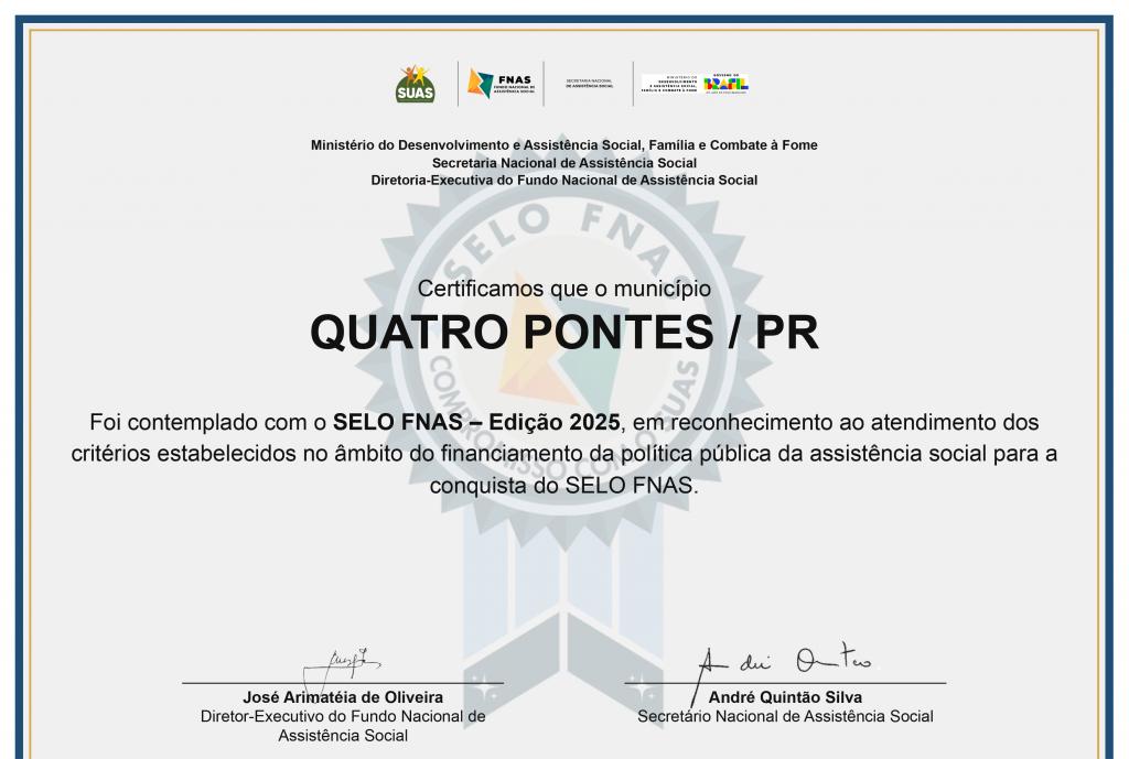 Quatro Pontes, 2 de abril de 2026 – O município de Quatro Pontes foi contemplado com o Selo FNAS – Edição 2025, reconhecimento concedido pelo Ministério do Desenvolvimento e Assistência Social, Família e Combate à Fome, por meio do Fundo Nacional de Assistência Social.