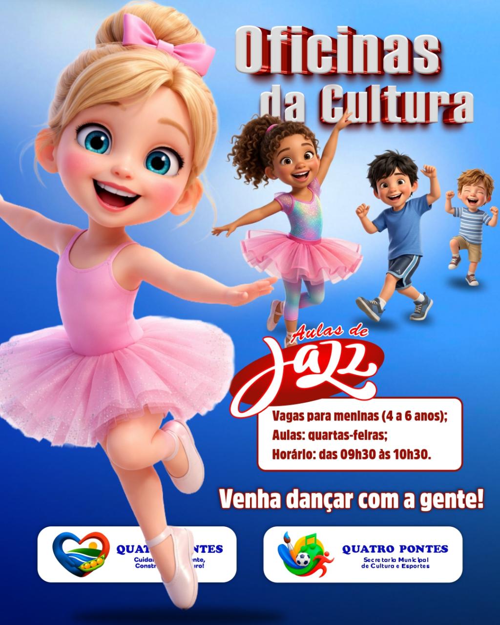 Quatro Pontes, 17 de abril de 2026 – A Secretaria Municipal de Cultura e Esportes informa que ainda há vagas disponíveis para a turma de Jazz destinada a crianças de 4 a 6 anos, no período da manhã. As aulas já estão em andamento, mas novos alunos ainda podem ser integrados à turma.