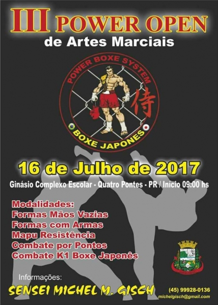 O Sensei Michel Mathias Gish, um dos organizadores do evento, conclama toda comunidade de Quatro Pontes, bem como os simpatizantes de toda região, para prestigiar este evento que promete disputas acirradas. Serão apresentadas as modalidades: Formas Mãos Vazias e com Armas (Tchaco, espadas e outras armas), Mapu Resistência, Combate por Pontos, Combate k1 Boxe Japonês.
