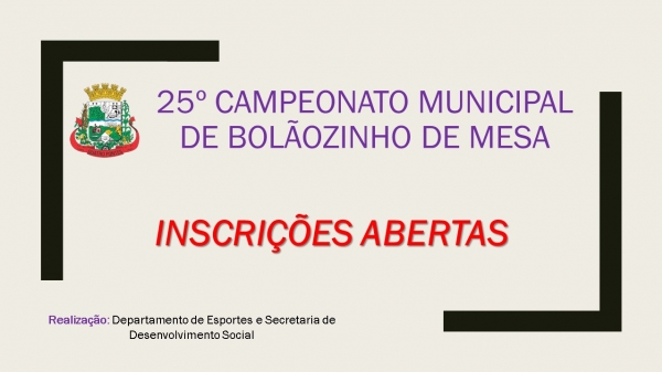Organizado pelo Departamento de Esportes e a Secretaria de Desenvolvimento Social, o 25º Campeonato Municipal de Bolãozinho de Mesa de Quatro Pontes terá inscrições abertas até o dia 17 de setembro, na categoria feminino adulto. Elas devem ser feitas com Marlene ou Alex, sendo que a taxa é de R$ 15 por equipe.