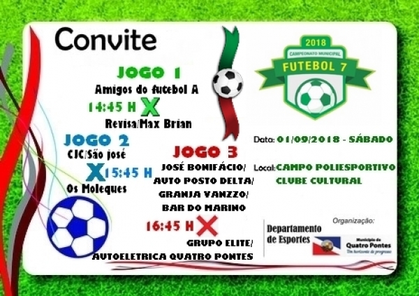 Terá início amanhã (1º) a 19ª edição do Municipal de Futebol Sete de Quatro Pontes, categorias amador e veterano masculino, organizado pelo Departamento de Esportes. Os jogos acontecerão no campo ao lado do Centro Poliesportivo Seno José Lang.