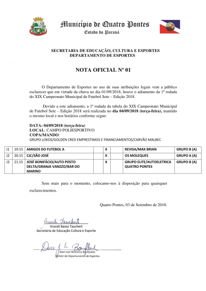 Em virtude do tempo chuvoso no sábado (1º), a primeira rodada do 19º Campeonato de Futebol Sete de Quatro Pontes foi adiada pelo Departamento de Esportes para amanhã (04). Os confrontos serão nas categorias amador e veterano e acontecerão no campo ao lado do Centro Poliesportivo Seno José Lang.