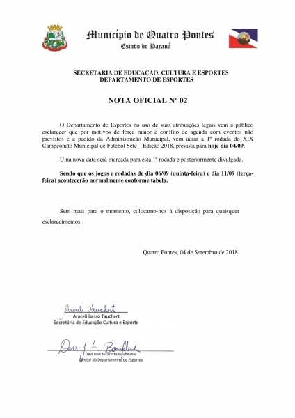 Por motivos de força maior, conflito de agenda com eventos não previstos e a pedido da administração municipal, o Departamento de Esportes novamente adiou a 1ª rodada do 19º Campeonato de Futebol Sete de Quatro Pontes, categorias amador e veterano, que estava marcada para hoje (04). Nova data será marcada e divulgada.