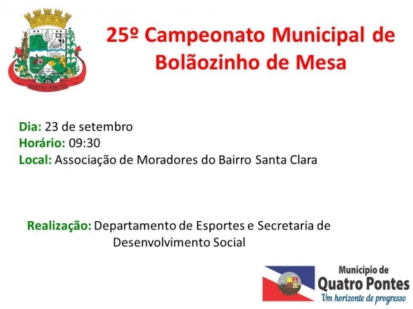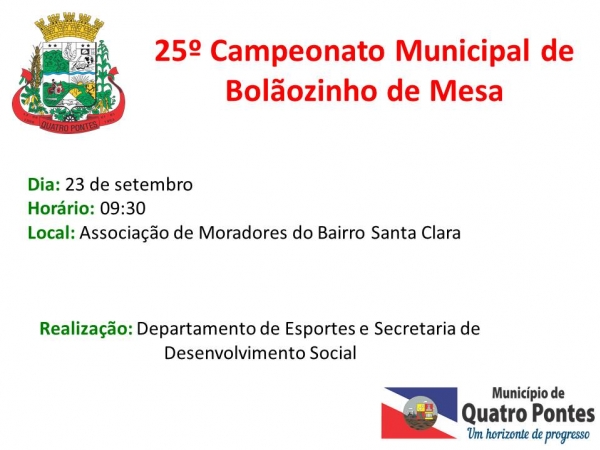 Representando oito clubes de mães de Quatro Pontes, 24 equipes participarão da 25ª edição do Campeonato Municipal de Bolãozinho de Mesa. A competição será realizada domingo (23), na Associação de Moradores do Bairro Santa Clara, sob a organização do Departamento de Esportes e da Secretaria de Desenvolvimento Social, com início às 09h30.