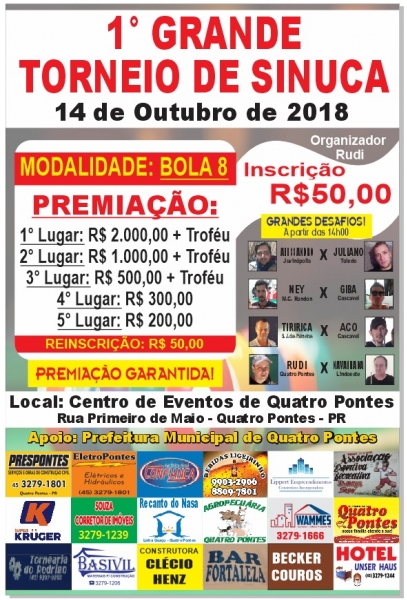Está marcado para domingo (14) o 1º Grande Torneio de Sinuca, na modalidade bola 8, no Centro Poliesportivo Seno José Lang, em Quatro Pontes. A competição é organizada por Rudi e conta com o apoio da prefeitura, por meio do Departamento de Esportes. O início é às 14 horas.