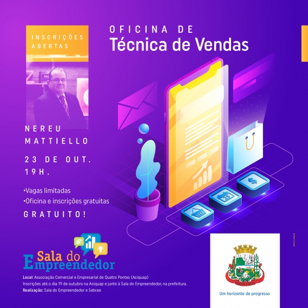 Seguem abertas as inscrições da oficina de técnica de vendas, viabilizada pela Sala do Empreendedor de Quatro Pontes, em parceria com o Sebrae. Elas devem ser realizadas até o dia 19 na Sala do Empreendedor, junto à prefeitura, ou na Associação Comercial e Empresarial (Aciquap). As inscrições e oficina são gratuitas.