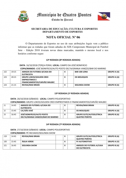 O Departamento de Esportes de Quatro Pontes, no uso de suas atribuições legais, fixou novas datas para realização das rodadas adiadas do 19º Campeonato de Futebol Sete, categorias amador e veterano, mantendo os mesmos locais.