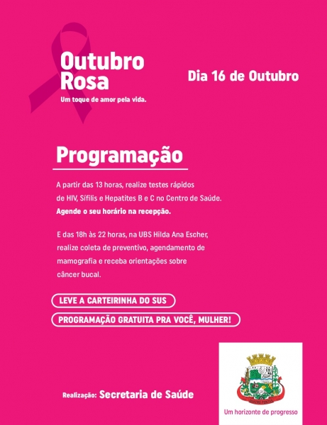 No Centro de Saúde, na terça-feira (16), as mulheres poderão realizar exames de teste rápido de HIV, sífilis e hepatite B e C, a partir das 13 horas, com a enfermeira Gislaine dos Santos. Para participar da atividade é necessário fazer agendamento prévio junto à recepção do Centro de Saúde, com Elizandra. A iniciativa é uma sequência ao trabalho de rotina.