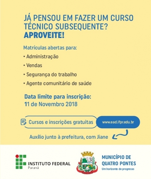 Administração, vendas, segurança do trabalho e agente comunitário de saúde são os cursos técnicos subsequentes que seguem com inscrições abertas em Quatro Pontes. Eles estão sendo ofertados gratuitamente pelo Instituto Federal do Paraná (IFPR), em parceria com a Secretaria de Educação, Cultura e Esportes.