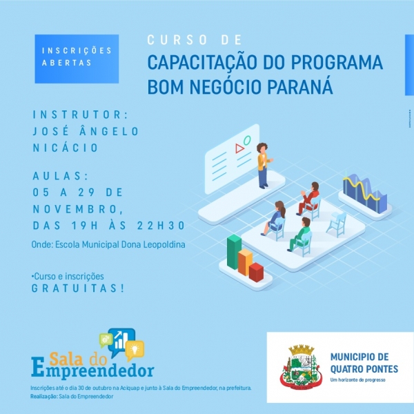 Em vista dos feriados e ponto facultativo na semana passada, a Sala do Empreendedor de Quatro Pontes prorrogou para hoje (05) as inscrições para o curso de capacitação do Programa Bom Negócio Paraná, ofertado gratuitamente. A matrícula, que também é de graça, precisa ser realizada na Sala do Empreendedor, junto à prefeitura, ou na Associação Comercial e Empresarial (Aciquap).