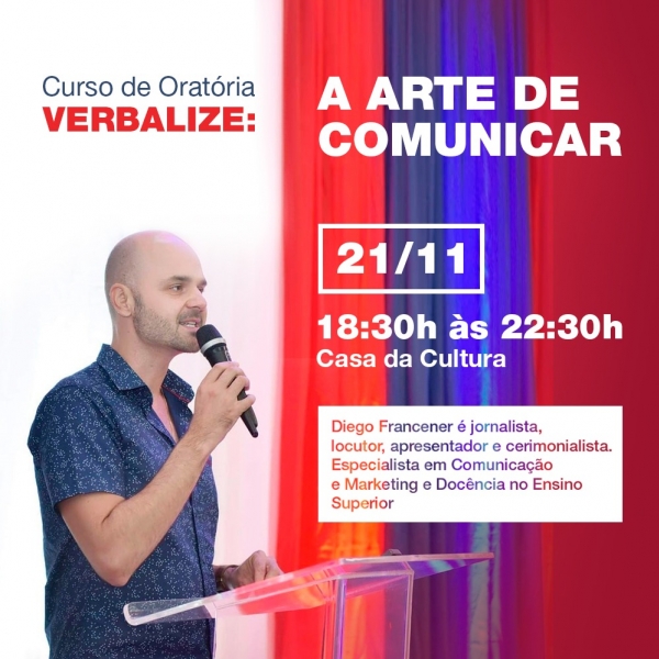 Com a temática “Verbalize: a arte de se comunicar”, a capacitação será aplicada pelo especialista em comunicação e marketing e jornalista, Diego Francener. Ele destacará técnicas de comunicação, comunicação verbal e não verbal, postura em entrevistas, gesticulação, microfone, enfrentamento e medo e prática.