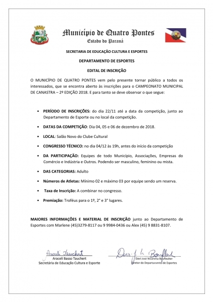 A 2ª edição do Campeonato Municipal de Canastra de Quatro Pontes está com as inscrições abertas junto ao Departamento de Esportes, no Centro Poliesportivo Seno José Lang, até a data da competição, marcada para 04, 05 e 06 de dezembro, no salão novo do Clube Cultural. Na ocasião, também poderão ser feitas inscrições.