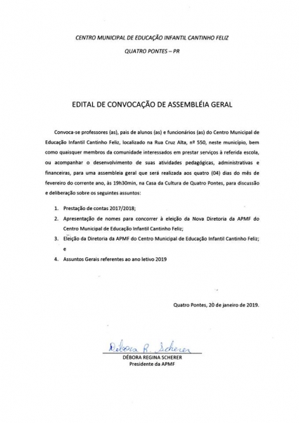 É de suma importância a participação dos pais, em especial, pois na ocasião será feita a prestação de contas de 2017/2018, apresentação de nomes para concorrer à eleição da nova diretoria da Associação de Pais, Mestres e Funcionários (APMF), eleição da nova diretoria da APMF e assuntos gerais referentes ao ano letivo de 2019.