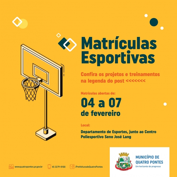 Gratuitas, os Departamentos de Cultura e Esportes encerram hoje (07) as matrículas para as oficinas, projetos e treinamentos disponibilizados de graça em Quatro Pontes, atendendo de crianças até idosos. As matrículas culturais devem ser feitas na Casa da Cultura, com Denise, e as esportivas no Centro Poliesportivo Seno José Lang, junto ao Departamento de Esportes, com Marlene, sendo que os professores também auxiliam.