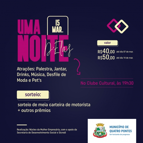 O primeiro lote de ingressos ao valor de R$ 40 para o “Uma noite d’elas” encerra hoje (07) em Quatro Pontes. Após, até a próxima quinta-feira (14), custará R$ 50. O evento, alusivo ao Dia da Mulher, celebrado em 08 de março, está sob a organização do Núcleo da Mulher Empresária, com o apoio da Secretaria de Desenvolvimento Social e Sicredi, e ocorrerá no dia 15, a partir das 19h30, no Clube Cultural.