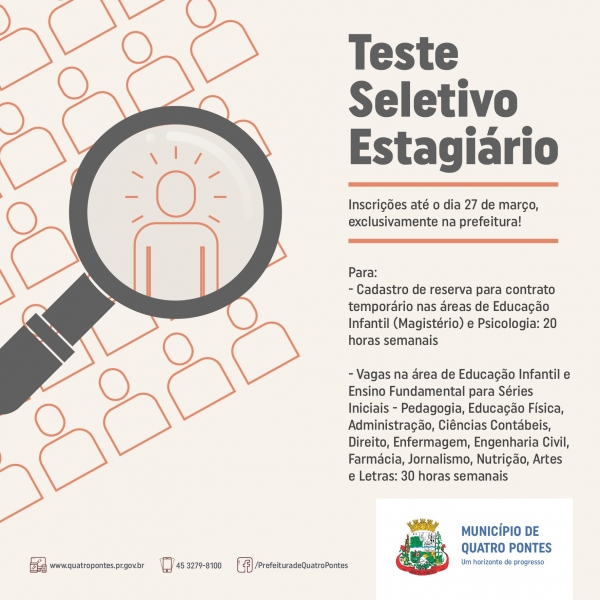 A Prefeitura de Quatro Pontes encerrará na quarta-feira (27) as inscrições para o teste seletivo de estagiários, que devem ser realizadas exclusivamente na prefeitura, via protocolo, das 08h30 às 11h45 e das 13h45 às 17 horas.