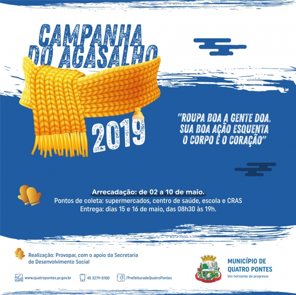 Acontecerá na quarta (15) e quinta-feira (16) o repasse das roupas e calçados arrecadados pela Campanha do Agasalho 2019, intitulada “Roupa boa a gente doa. Sua boa ação esquenta o corpo e o coração”.