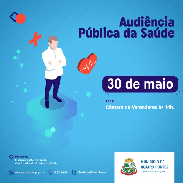 Está marcada para as 14 horas de hoje (30) uma audiência pública do Fundo Municipal de Saúde de Quatro Pontes, na Câmara de Vereadores. Na ocasião, será realizada a apresentação da prestação de contas e a oferta e produção de serviços públicos na rede assistencial própria, contratada e conveniada em seu âmbito de atuação do primeiro quadrimestre de 2019.