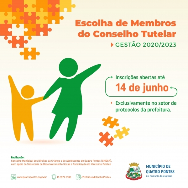Terminam na próxima semana, dia 14, as inscrições para processo de escolha em data unificada de membros do Conselho Tutelar, gestão 2020/2023, em Quatro Pontes. A realização é do Conselho Municipal dos Direitos da Criança e do Adolescente (CMDCA), com o apoio da Secretaria de Desenvolvimento Social e a fiscalização do Ministério Público. A ficha específica deve ser preenchida pessoalmente no setor de protocolos da prefeitura, das 08h30 às 11h30 e das 14 às 17 horas, de segunda à sexta-feira.