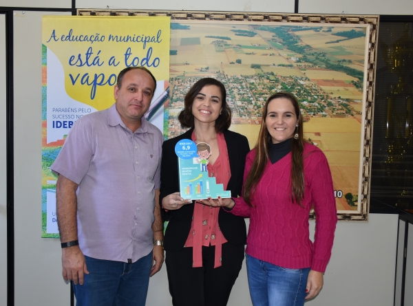O Índice de Desenvolvimento da Educação Básica (Ideb) avançou na rede municipal de ensino de Quatro Pontes. A nota na Prova Brasil, realizada pelo Ministério da Educação (MEC) em outubro de 2017, saiu de 6,5 em 2015 para 6,9 em 2017 nos anos iniciais da Escola Municipal Dona Leopoldina, superando a média projetada para 2017, que era de 6,3. Por conta disso, ontem (10) o prefeito João Laufer e a secretária de Educação, Cultura e Esportes, Araceli Basso Tauchert, receberam um troféu pela conquista, que foi entregue pela assessora pedagógica da Editora Positivo, Yasmim Paim Forte.