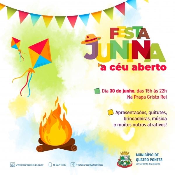 Já na 3ª edição, Quatro Pontes terá no domingo (30) a Festa Junina à Céu Aberto na Praça Cristo Rei, organizada pela prefeitura. O evento acontecerá das 15 às 22 horas e é aberto para a comunidade em geral, inclusive visitantes.