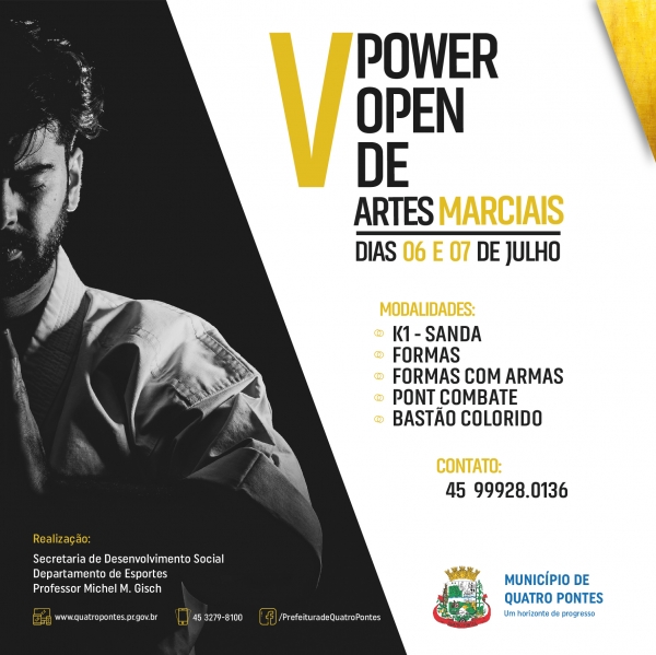 Organizado pelo Departamento de Esportes, Secretaria de Desenvolvimento Social e o professor Michel M. Gisch, o 5º Power Open de Artes Marciais movimentará Quatro Pontes neste final de semana. O evento ocorrerá no Ginásio de Esportes do Complexo Escolar e deve reunir cerca de 250 participantes, oriundos de Quatro Pontes, Toledo, Cascavel, Matelândia, Foz do Iguaçu, Santa Catarina, Paraguai, entre outros locais.