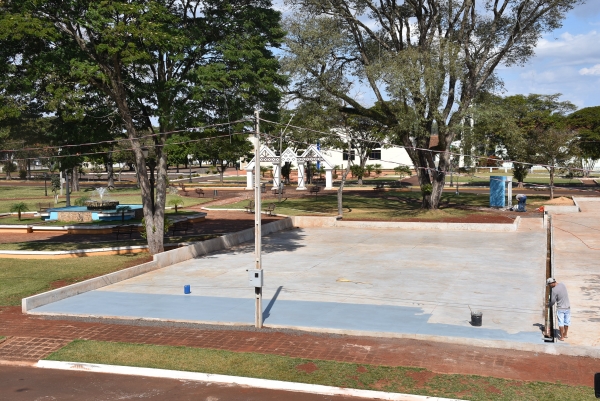 Hoje (23), a Backes e Fukita Ltda., empresa vencedora do processo licitatório, começou os serviços de pintura na quadra junto à Praça Cristo Rei, de Quatro Pontes, seguindo com os trabalhos complementares para implantação da arena poliesportiva. De modo recente, o Governo do Estado liberou a sua instalação e nos próximos dias o espaço receberá estruturas de arquibancadas em madeira ou chapa metálica, alambrados de material anticorrosivo, gramado sintético aprovado pela Fifa, com sistema de absorção de impacto (o amortecimento é feito com pequenos pedaços de borracha de pneu reciclado - 1,8 mil pneus são retirados do meio ambiente), incluindo os refletores, oferecendo condições para a prática de futebol, basquetebol, voleibol e skate.