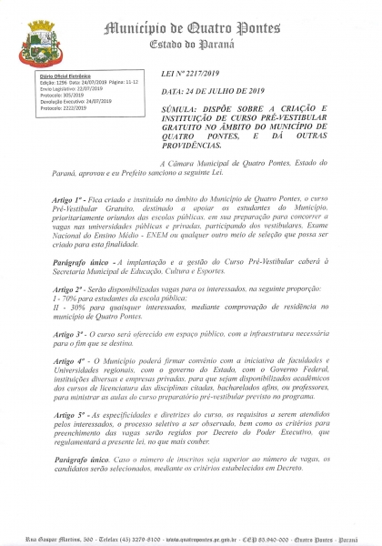Destinado a apoiar os estudantes do município, prioritariamente oriundos da escola pública, curso pré-vestibular gratuito integrará a educação de Quatro Pontes. A lei foi criada pelo Poder Executivo, sendo aprovada pelo Legislativo na semana passada. A iniciativa tem como finalidade a preparação para concorrer a vagas nas universidades públicas e privadas, participando dos vestibulares, Exame Nacional do Ensino Médio (Enem) ou qualquer outro meio de seleção que possa ser criado para esta finalidade, cabendo à Secretaria de Educação, Cultura e Esportes a implantação e gestão do curso.