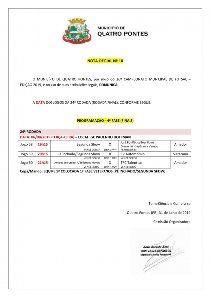 A 24ª e rodada final do 26º Campeonato Municipal de Futsal será realizada hoje (06) pelo Departamento de Esportes, com a coordenação de Jean Zeni, junto ao Ginásio de Esportes Paulinho Hoffmann. O primeiro jogo (amador) está marcado para as 19h15 e será entre Segunda Show e José Bonifácio/Beer Point Conveniência/Granja Vanzzo, que irão disputar o 3º e 4º lugar.
