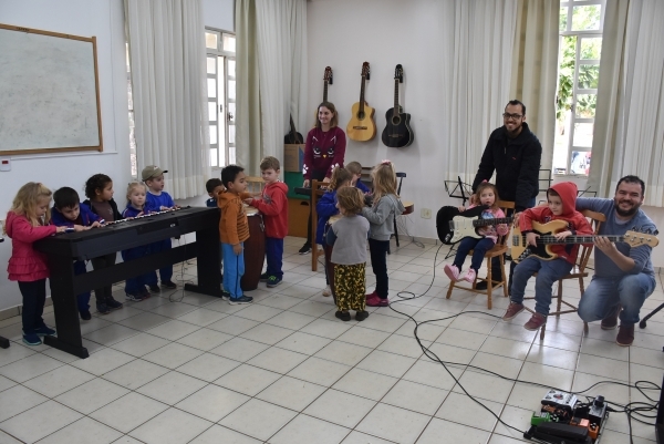 Os alunos do maternal II, vespertino, do Centro Municipal de Educação Infantil (Cmei) Cantinho Feliz, de Quatro Pontes, acompanhados da professora Paula C. B. Vergutz e da auxiliar Claudineia Zelenski, realizaram uma visita ontem (05) na Casa da Cultura, com o interesse de conhecer os instrumentos em que a música se efetiva. Eles foram recepcionados pelo diretor do Departamento de Esportes, Davi Boufleuher, sendo que a demonstração de alguns aparelhos foi feita pelos professores Evandro Andrejeski e Kalvin Tonelli de Jezus.