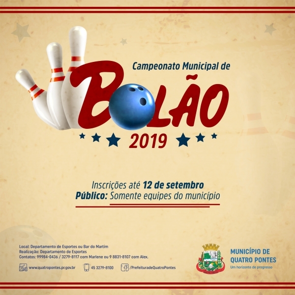 Seguem abertas até o dia 12 de setembro as inscrições para o Campeonato Municipal de Bolão 2019, categorias feminino e masculino, organizado pelo Departamento de Esportes, de Quatro Pontes. Elas devem ser feitas junto ao departamento ou no Bar do Martim.