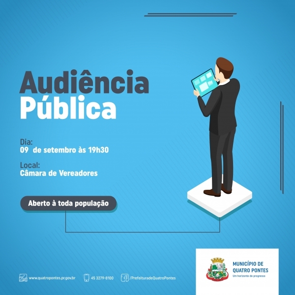A Prefeitura de Quatro Pontes realiza às 19h30 de hoje (09) uma audiência pública na Câmara de Vereadores, aberta para toda a população. Em pauta, a desapropriação de área por utilidade pública, parte da rua marginal do Loteamento Parque Industrial III, Patrimônio do Município de Quatro Pontes, por meio do Departamento Nacional de Infraestrutura de Transportes - Superintendência Regional do DNIT.