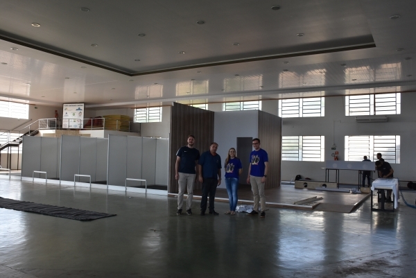Hoje (09), o prefeito João Laufer e o secretário de Administração, vice-prefeito Tiago Hansel, com o presidente da CCO, Davi Boufleuher, a secretária de Educação, Cultura e Esportes, Araceli Basso Tauchert, e o secretário de Obras, Urbanismo e Transportes, Luis Carlos Becker, verificaram o desenvolvimento da montagem de tendas, estandes e decoração.