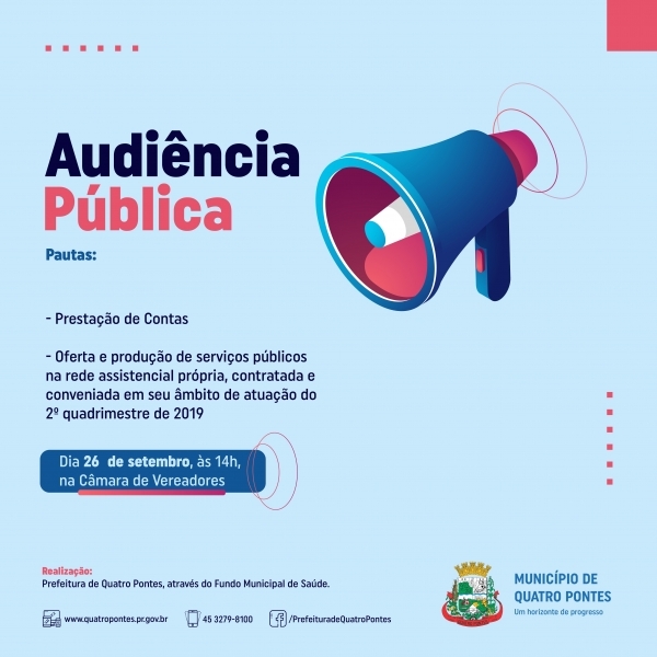 Às 14 horas de hoje (26) terá início a audiência pública do Fundo Municipal de Saúde de Quatro Pontes, na Câmara de Vereadores. A população está convocada a participar, pois assuntos importantes sobre a saúde serão apresentados e discutidos.