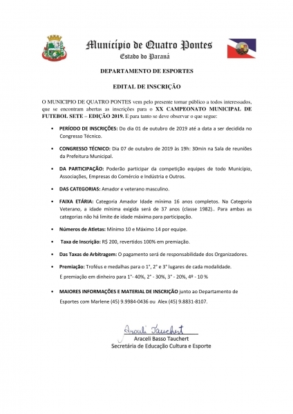 A 20ª edição do Campeonato Municipal de Futebol Sete está com as inscrições abertas em Quatro Pontes. Elas devem ser realizadas no Departamento de Esportes, organizador da competição, ou através dos telefones 99984-0436 (Marlene) e 98831-8107 (Alexsandro).