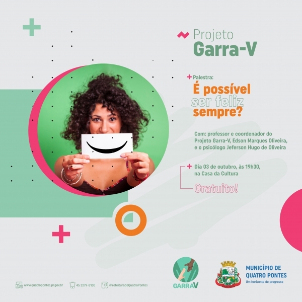 Esta é a primeira palestra dentro do projeto Garra-V que acontecerá no município, com a organização da Secretaria de Saúde, Secretaria de Educação, Cultura e Esportes e o Centro de Referência de Assistência Social (Cras). Ela é aberta para toda a comunidade, segundo o secretário de Saúde, Marco Antônio Wickert. “É uma palestra importante para toda a população, pois abordará a felicidade do ser humano. É sabido que em toda a região há pessoas acometidas pela depressão, entre outras doenças e/ou problemas e isso também será falado durante a palestra. Após, a intenção é formar um grupo e discutir diferentes assuntos, a fim de melhorar várias áreas da vida. É um projeto piloto, coordenado por profissionais da Unioeste de Toledo. A equipe da secretaria também será preparada para trabalhar o projeto, além de pessoas voluntárias, envolvendo a comunidade”, diz.
