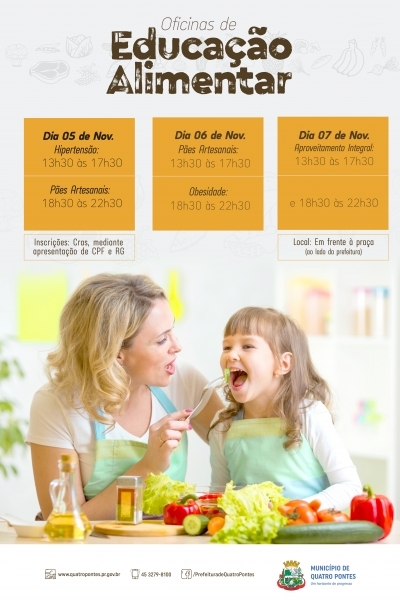 Até ao meio-dia de amanhã (05), público em geral de Quatro Pontes pode se inscrever nas oficinas gratuitas de educação alimentar do programa Cozinha Brasil, mediante a apresentação de RG e CPF junto ao Centro de Referência de Assistência Social (Cras). A inscrição é apenas presencial e não será garantida a reserva de vagas, sendo que são 20 para cada oficina.