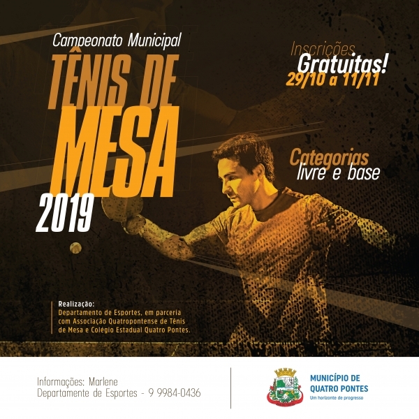 As inscrições para o Campeonato Municipal de Tênis de Mesa 2019 seguem abertas até a próxima segunda-feira (11) em Quatro Pontes. Na categoria livre, devem ser realizadas com Marlene no Departamento de Esportes ou pelo (45) 99984-0436. Já nas categorias “A” e “B”, as inscrições ocorrem na secretaria do Colégio Estadual Quatro Pontes, com o professor José Carlos, incluindo o Departamento de Esportes. E na categoria iniciante, interessados podem procurar a secretaria da Escola Municipal Dona Leopoldina, com o professor Djeferson, ou o Departamento de Esportes.