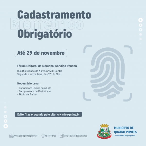 A Prefeitura de Quatro Pontes novamente está ofertando transporte gratuito ao Fórum Eleitoral da Comarca de Marechal Cândido Rondon visando o cadastramento biométrico do título de eleitor, que é obrigatório. Ele será realizado no próximo dia 14, às 14 horas, e os quatropontenses devem se inscrever na recepção da prefeitura ou pelo 3279-8100, deixando nome e telefone. A saída será em frente ao paço municipal.